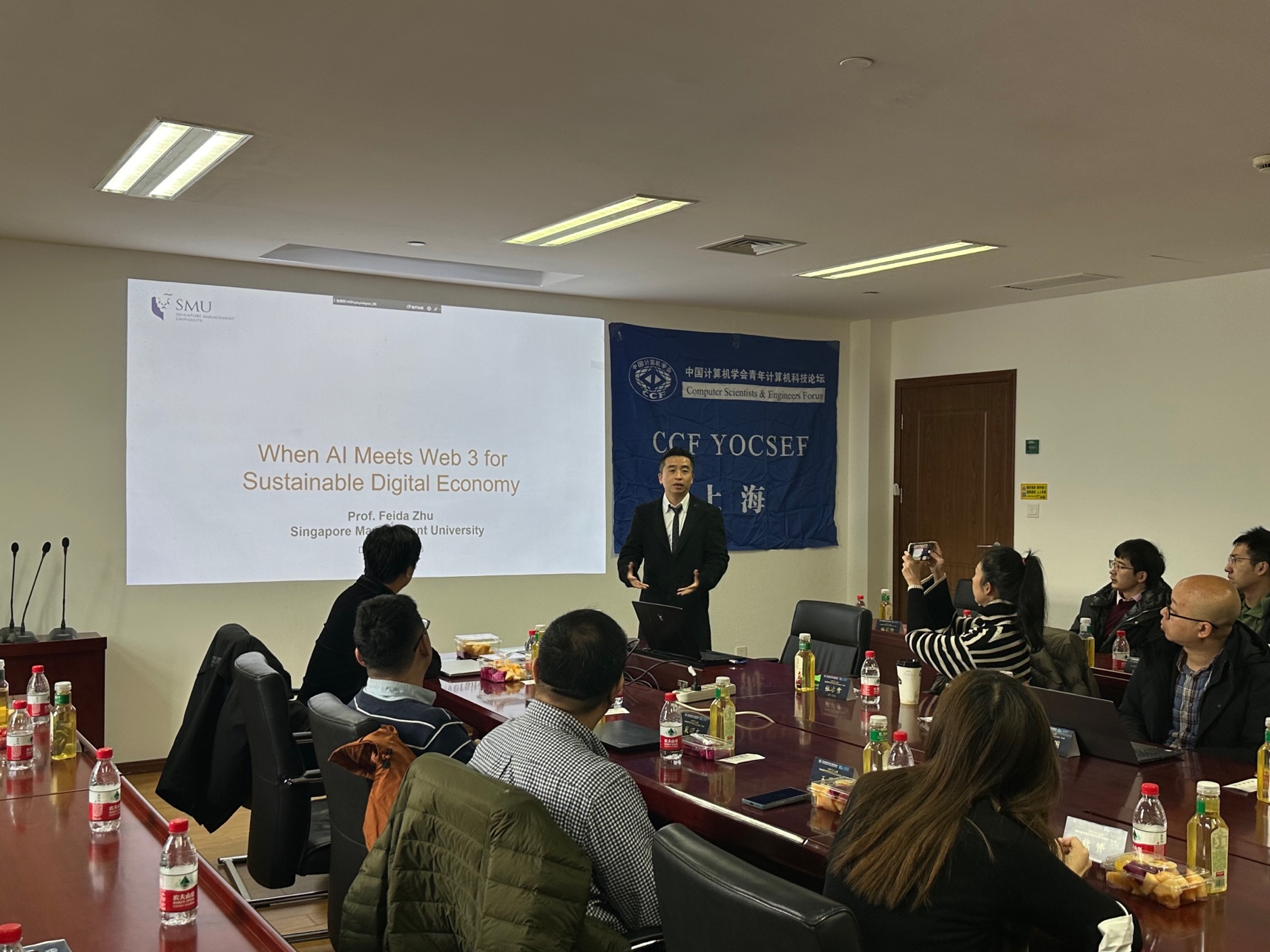 第一位演讲者是新加坡管理大学的朱飞达教授。朱飞达以《当AI遇上Web3:为可持续数字经济创新赋能》为题,发表了演讲。他全面剖析了当前数据治理、数据隐私保护等方面的挑战,从协同智能与通证化经济的视角,展望了未来的发展趋势和机遇。他还对新加坡管理大学与beat365在线唯一官网的深入合作提出了期待。演讲结束后,YOCSEF上海前主席裴颂文为其颁发感谢牌,以表彰其为本活动做出的贡献。