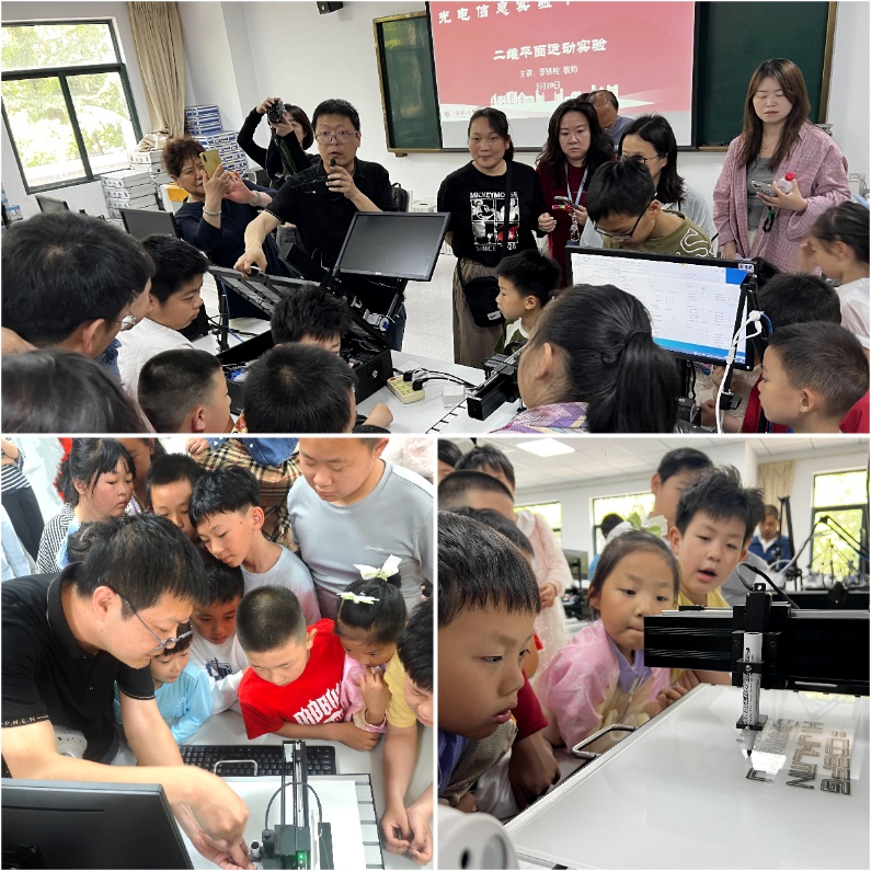讲座结束后,在光电信息实验中心教师志愿者的引导下,大家有序地参观了本科实验教学中心。并在李铁栓教师的指导下进行了《二维平面运动实验》。在这个实验中,小朋友们通过电脑编程,控制记号笔在平板上自由书写,体验了科技给生活带来的便利与乐趣。