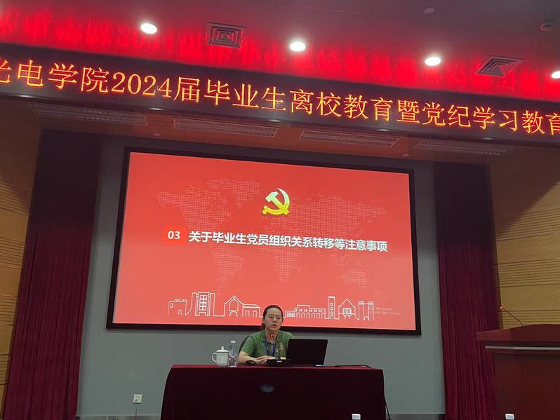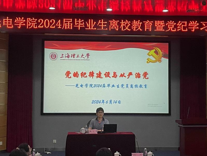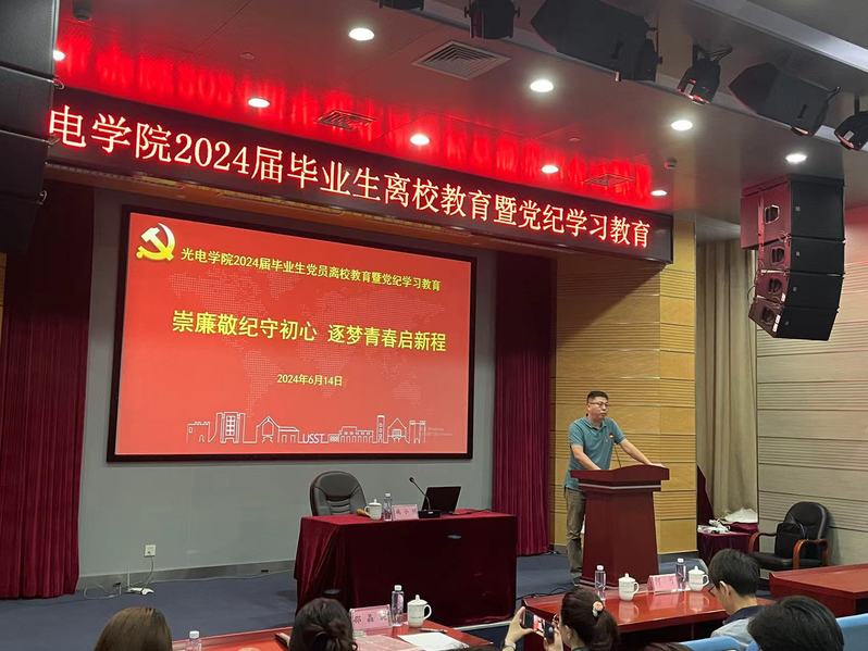 为推动党纪学习教育走深走实,加强毕业生党员离校教育,6月14日下午,光电学院开展主题为“崇廉敬纪守初心,逐梦青春启新程”的毕业生党员离校教育暨党纪学习教育。学院全体毕业生党员和预备党员参加教育。