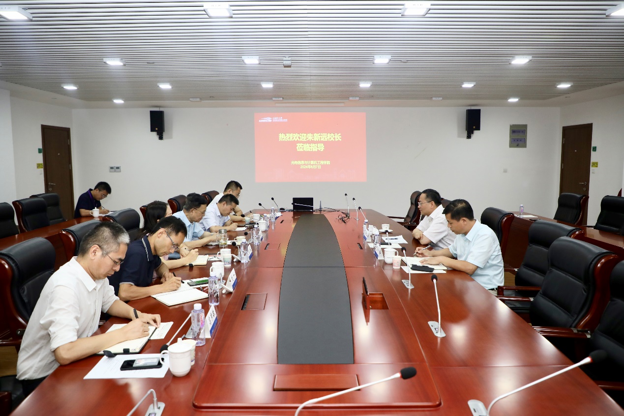 庄松林代表学院对朱校长的到来表示热烈的欢迎,他表示,朱校长首站到光电学院调研,体现了对学院发展的深切关怀和高度重视,令我们备受鼓舞,学院将以此为动力,进一步明确高质量发展方向,推动各项工作再上新台阶。