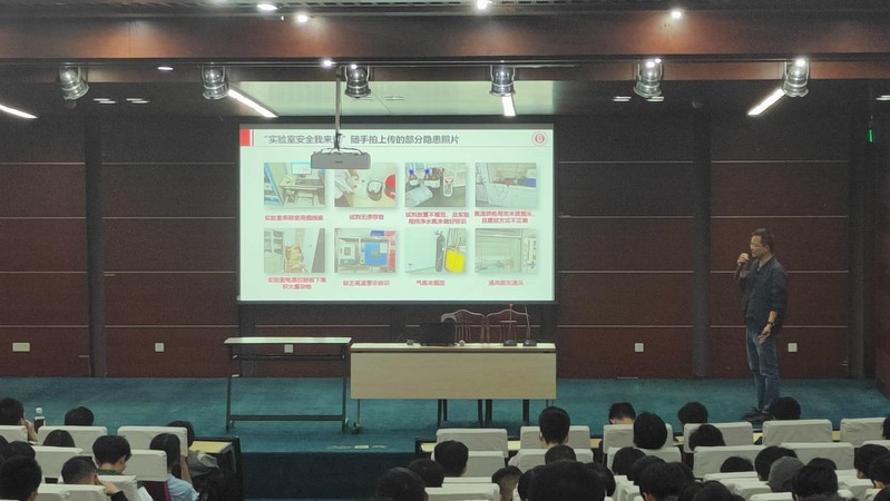 会上,学院实验室管理负责人周军做了实验室安全教育主题宣讲,他详细讲解了实验室场景中各类常见事故源头、潜在安全隐患,以及相应的防范措施,通过数个因为疏忽而导致的火灾事故案例为同学们敲响了警钟,提醒同学们严格遵守校园规章制度,重视实验室安全生产管理规范。