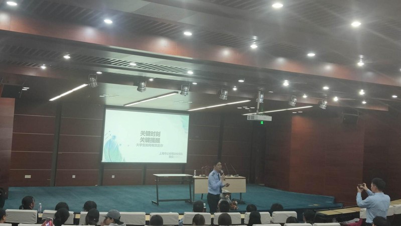 随后,上海市治安总队黄奕警官为同学们做反诈专题宣讲。黄警官分享了许多上海一线反诈工作中的真实案例,从亲身抓获犯罪嫌疑人到日常生活中上门诈骗的生动例子。他通过自己的工作经验提醒同学们识别最常见的几类诈骗形式,如电话诈骗,如何识别打电话的人是自己的亲人还是罪犯。最后,黄警官强调全国反诈电话是96110,遇到这个电话号码及时接听,防止自己或者身边亲人成为下一个被骗的受害者。最后,防范电信诈骗,人人有责,随时保持警惕、切勿上当受骗,切实保障自己的人身安全和财产安全。