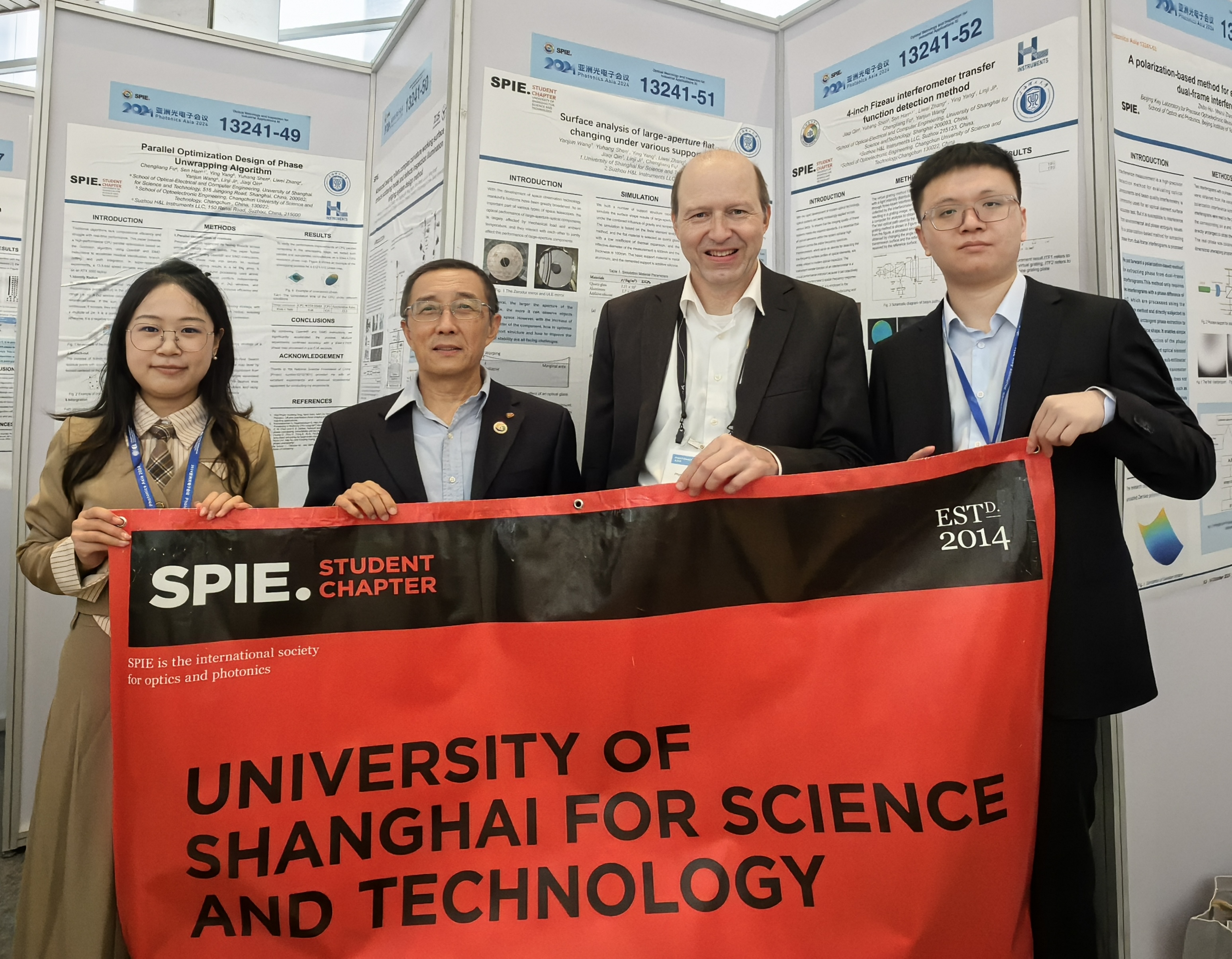 SPIE上理学生分会海报展示(左起:杨颖同学、韩森教授、Gerd Ehret博士、沈宇航同学)