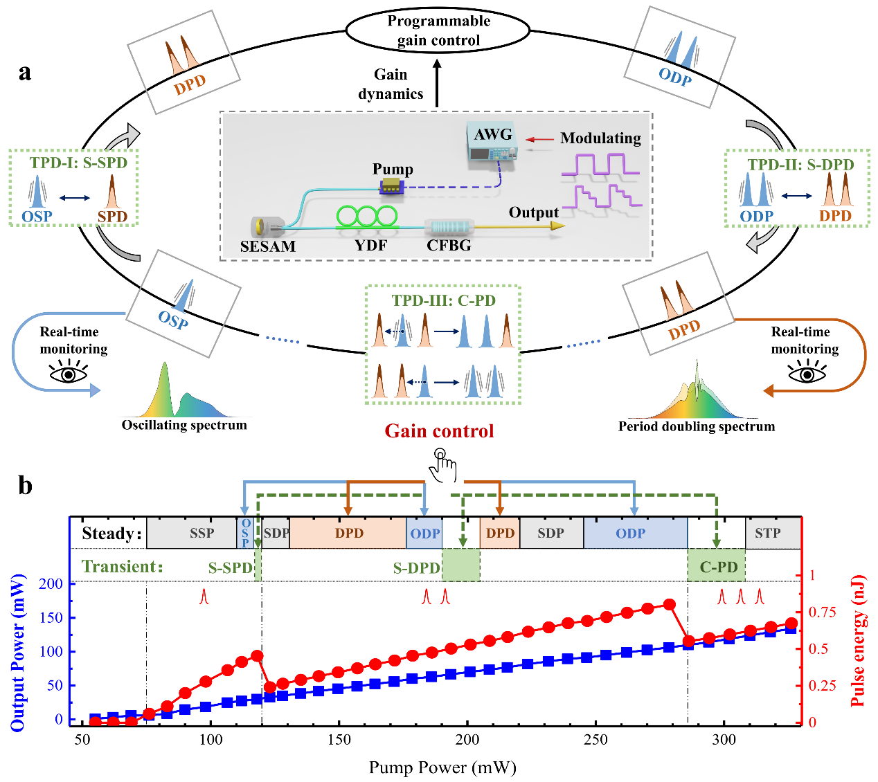 周期加倍分岔是混沌理论的重要概念,可以作为复杂系统从有序进入无序的典型方式,在经济学、生态研究和流体动力学中都有直观体现。但是,目前为止,周期加倍分岔孤子的研究仍局限于自维持的准稳态,对其动态规律还知之甚少。beat365在线唯一官网与华东师范大学、香港大学合作,采用全保偏可饱和吸收体锁模的光纤激光器作为研究对象,有效避免温度、震动等环境变化导致的偏振态扰动。实验中,通过调节泵浦功率实现增益控制,精确操控光纤激光器中各类孤子的产生和切换,尤其是首次实现了周期加倍孤子与其他孤子的状态切换与编码,编码速率达到千赫兹量级,相比以往通过手动偏振态控制实现的编码速率大幅提升。