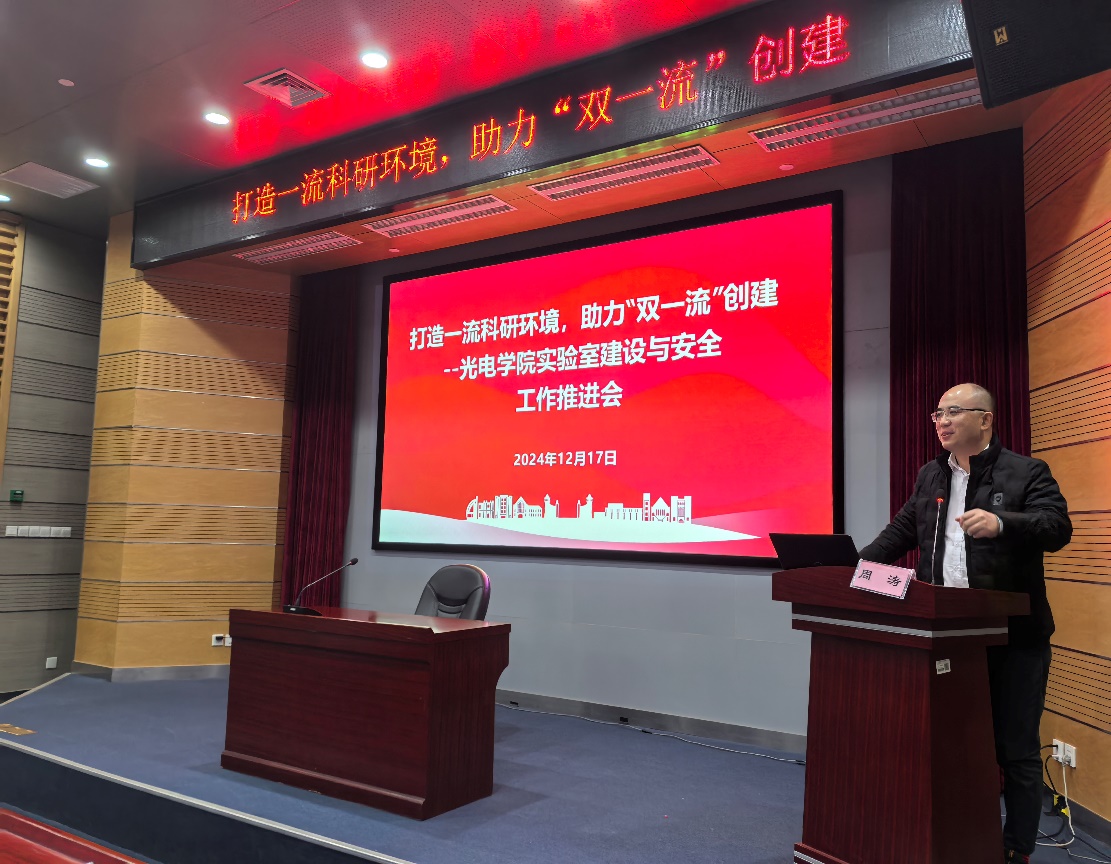 为深入学习贯彻习近平总书记关于安全生产的重要论述和指示批示精神,贯彻落实学校“向建设要发展、向管理要效率”的要求,12月17日下午,光电学院以“打造一流科研环境,助力‘双一流’创建”为主题,举办了实验室建设与安全工作推进会。会议邀请教育部高校科研实验室技术安全专家、科研实验室安全现场检查组组长、中国高等教育学会实验室管理分会常务理事、上海交通大学实验室安全与环保中心副主任彭华松研究员,学校资产设备与实验室管理处处长周涛作专题报告。学院党政领导班子、各实验室负责人、部分教师及学生代表参加会议。会议由副院长刘鹏主持。