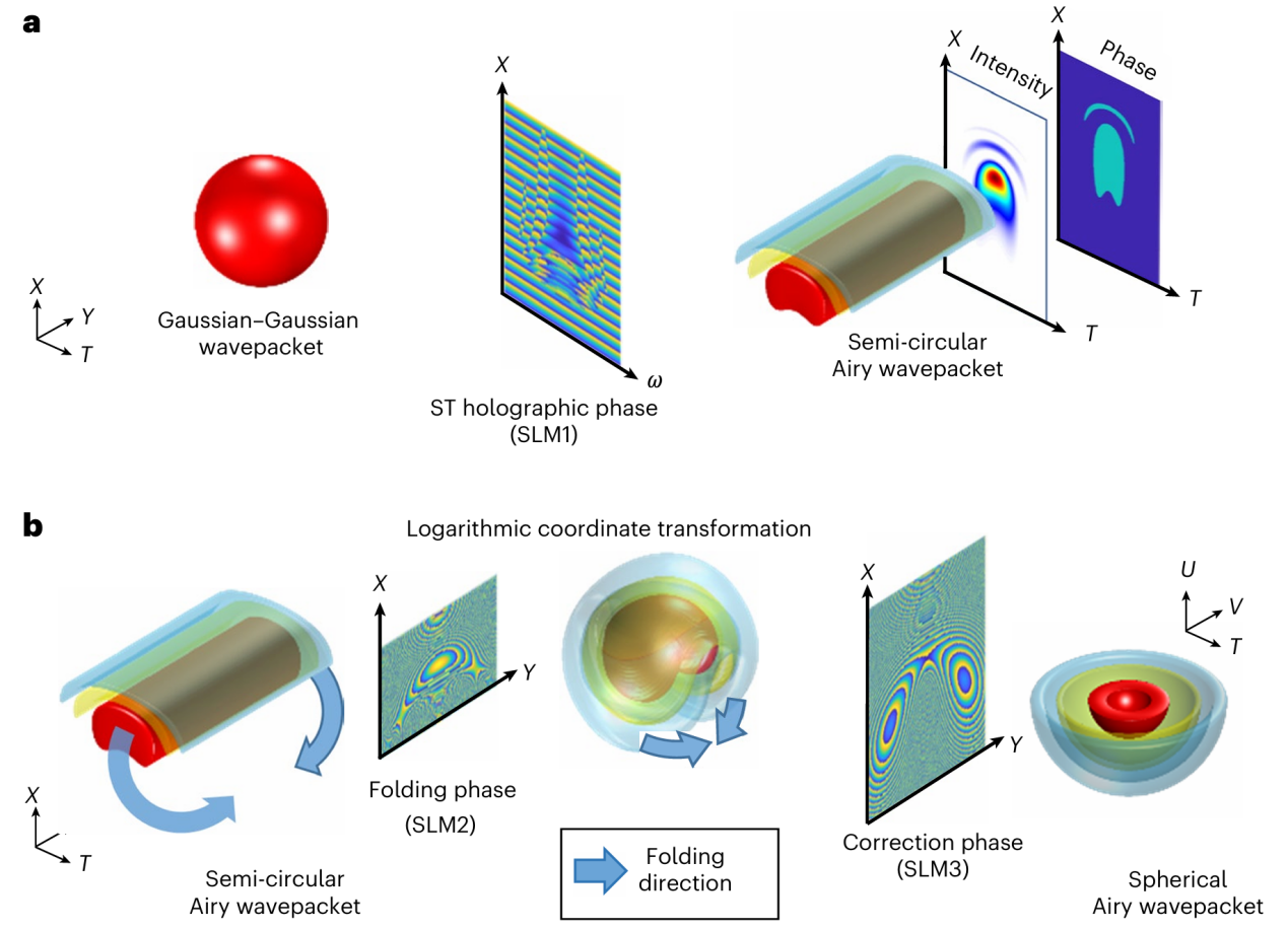 以光场精准“聚焦”并操控能量与物质的超快光镊、高分辨成像与激光微纳加工技术,深刻塑造了现代光学与光子学的发展路径。传统高斯光束在焦点附近强度变化平缓、焦深较大,严重制约了轴向分辨率与加工精度。环形艾里光束虽具备突变自聚焦特性,但仍局限于二维空间结构,尚未拓展至全时空三维体系。球形艾里波包在三维时空域内具有径向的艾里函数分布,因其三维时空耦合结构,调控难度极高,自2011年理论提出以来,始终未能在实验中实现。