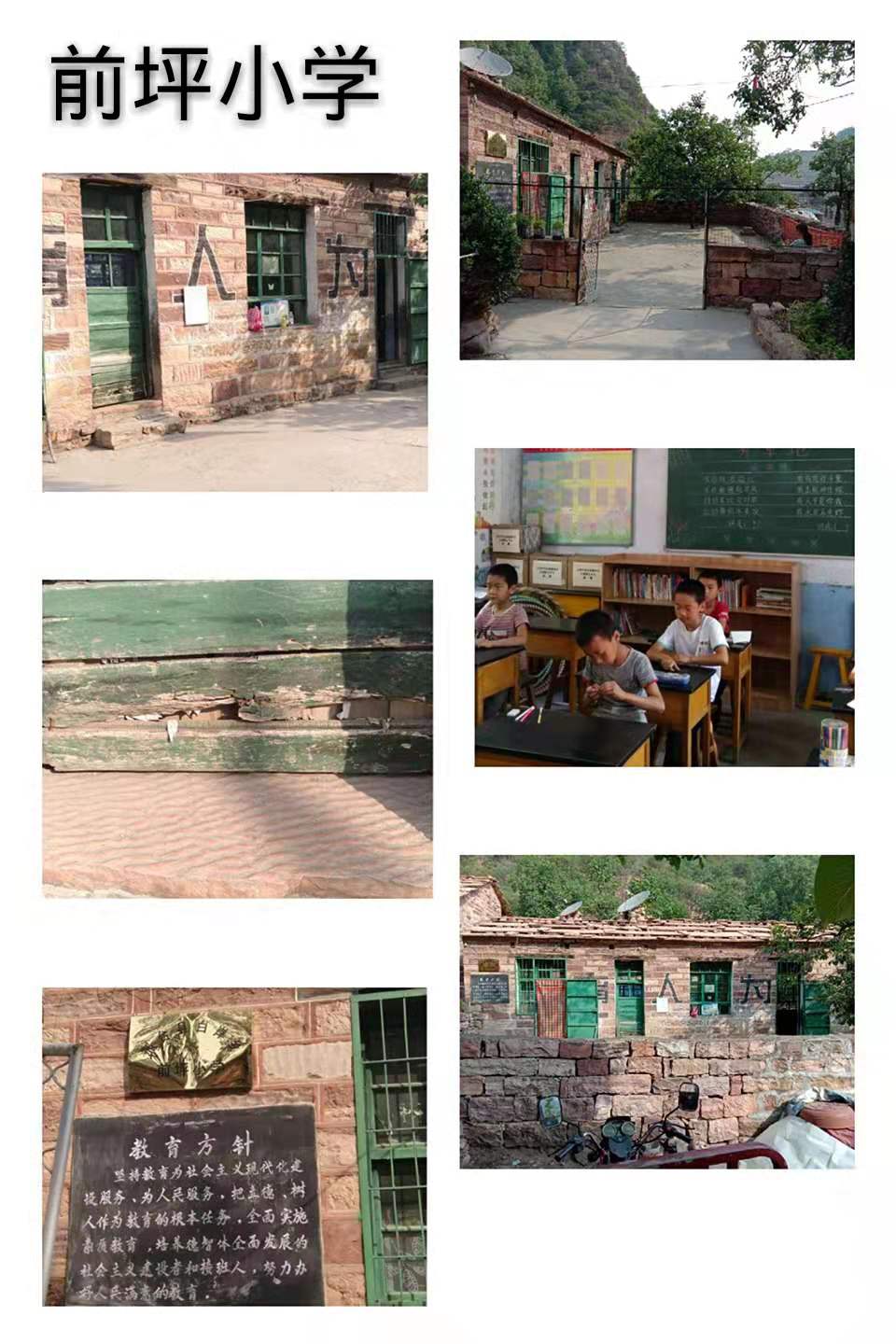 前坪小学位于在紫金山脚下,学校只有5个年级两个教学班,共有学生21人。办学条件薄弱,硬件设施不达标,音体美器材少之又少,没有活动室,没有图书室,仅有的两个教室是90年代的石板房,定为危房。电教器材仅有的一台电脑和一台打印机,教学条件差。