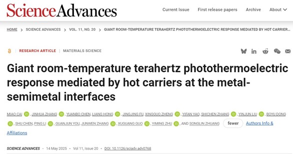近日,beat365在线唯一官网光电学院庄松林院士领导的太赫兹技术创新团队创新性地提出了一种用于实现室温高灵敏快速太赫兹探测的新型器件及其应用。该研究成果以题为“金属-半金属界面热载流子介导的巨大室温太赫兹光热电响应”(“Giant room-temperature terahertz photothermoelectric response mediated by hot carriers at the metal-semimetal interfaces”)发表在《科学进展》(Science Advances,中科院一区,影响因子11.7)上。论文第一作者为蔡苗博士,通讯作者为朱亦鸣教授,郭旭光研究员。