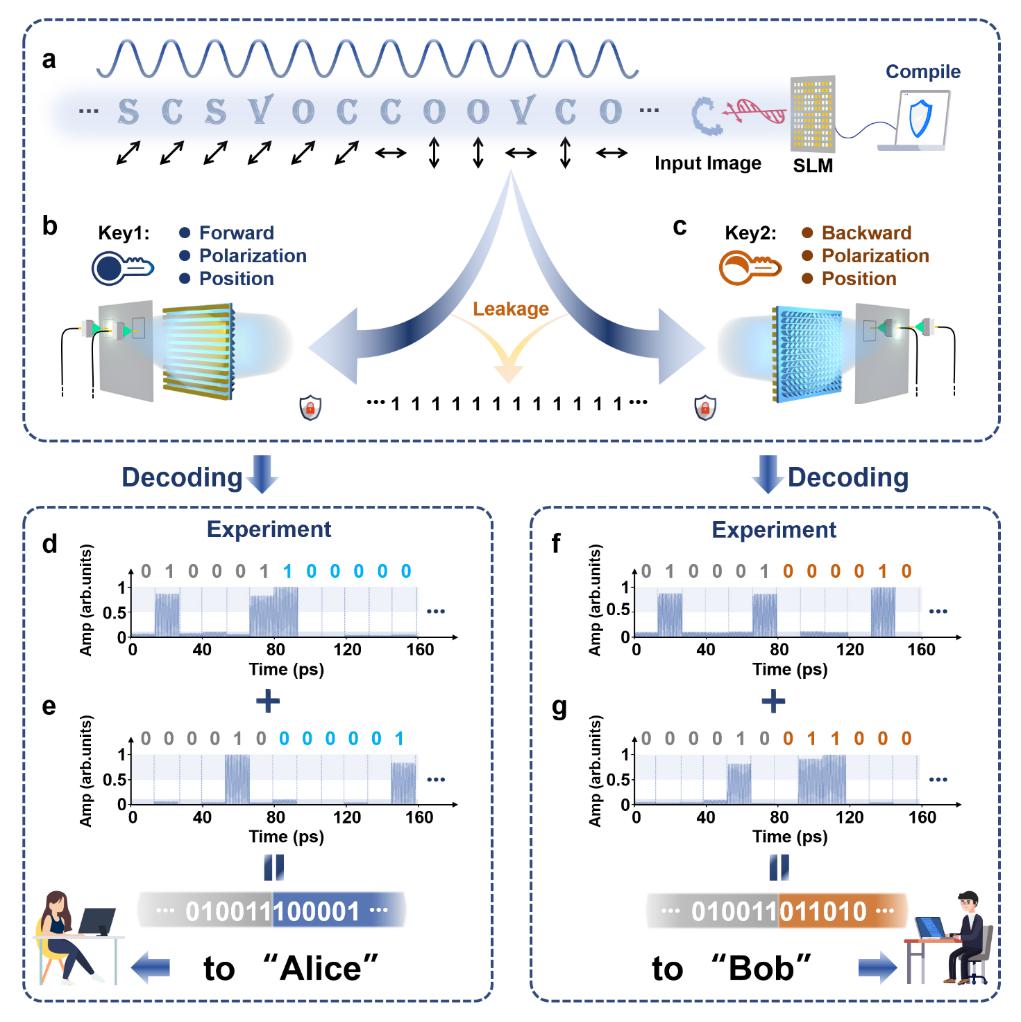 本研究针对传统全光大容量信息处理中信息安全与数据共享的矛盾,提出了级联型超构表面偏振可控的衍射神经网络新架构,通过融合相位调控、偏振转换及方向/偏振选择功能,实现了神经网路的单向信息加密和双向信息共享功能切换。针对传统3D打印衍射表面自由度受限的问题,研究团队创新性地将四分之一波片(QWP)超构原子阵列与金属光栅级联,实现数字分类和无损成像的偏振可选择的单向-双向衍射神经网络。进一步,将半波片(HWP)超构原子阵列和金属光栅级联实现了功能切换更为全面的单向-双向-单向DNNs。最后,基于PS-DNNs设计了一种高安全性能的信息传输和数据交换新架构。实验结果表明,该架构能够在同一物理平台上实现海量数据传输的同时实现特定数据的加密和共享。相关研究为全光计算,全光信息处理和通信安全提供新的思路。