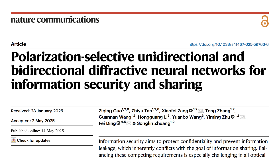 近日,在beat365在线唯一官网庄松林院士指导下,太赫兹技术创新团队臧小飞教授、朱亦鸣教授联合东方理工大学丁飞教授课题组,提出了一种实现偏振可选择的衍射神经网络(PS-DNNs)新方法。通过联合相位和偏振多自由度调控,实现了偏振可控的单向与双向网络功能切换,从而同步达成信息加密与共享的目的。研究成果以“超构表面衍射神经网络实现全光信息加密和共享”(“Polarization-selective unidirectional and bidirectional diffractive neural networks for information security and sharing”)为题发表于《自然·通讯》(Nature Communications,IF=14.7,中科院一区)上,博士生郭子晴为第一作者,谭知雨博士为论文的共同一作,臧小飞教授、朱亦鸣教授 、丁飞教授为通讯作者。
