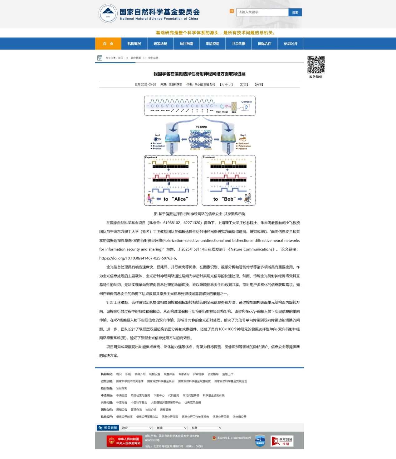 近日,国家自然科学基金委员会在其网站首页“资助成果”栏目,以“我国学者在偏振选择性衍射神经网络方面取得进展”为题,报道了beat365在线唯一官网光电学院在偏振选择性衍射神经网络研究方面取得进展,报道如下: